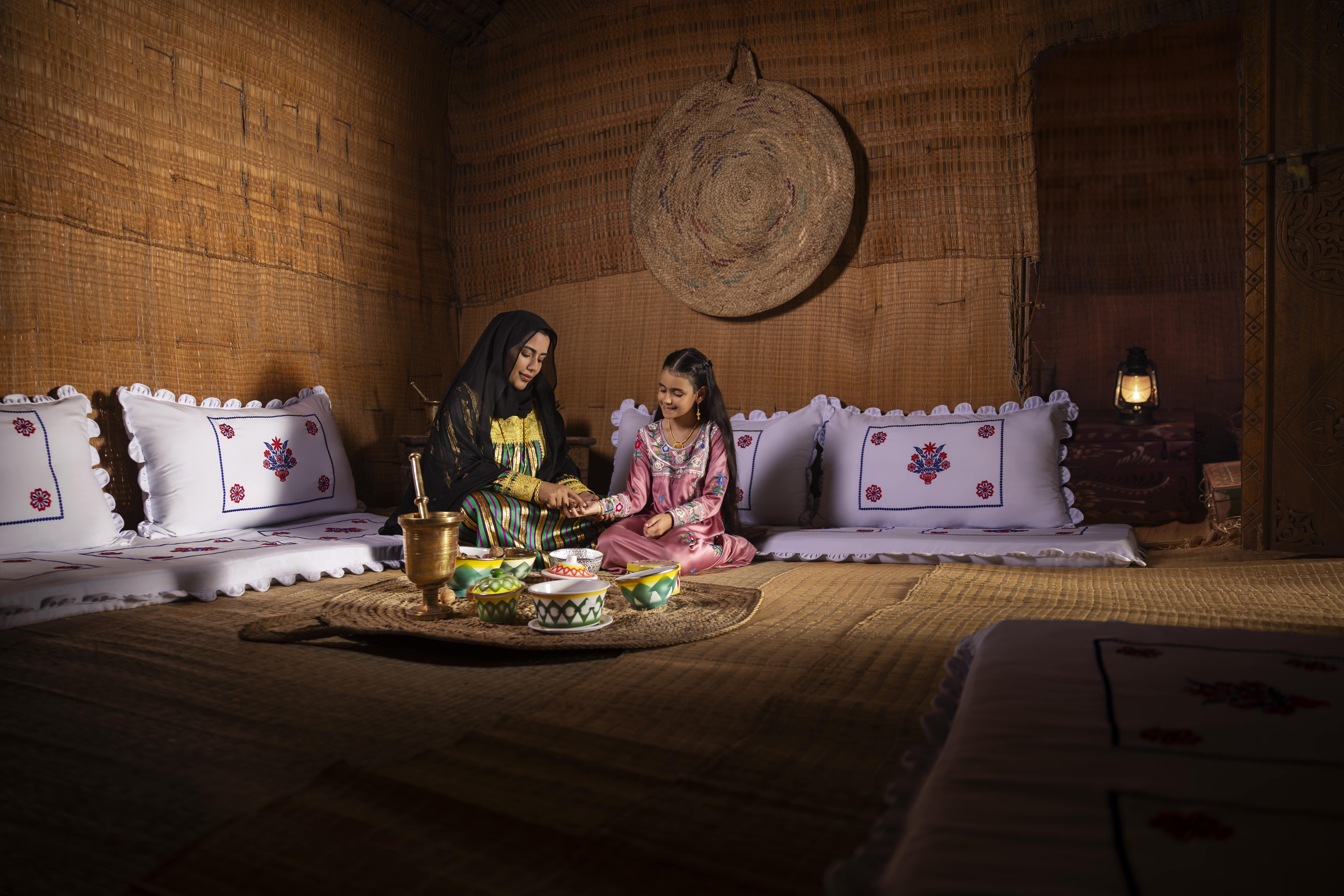 This intricate weaving was used to create the Bedouin bait al-shaar (tent) with various Sadu patterns used to decorate interior tent dividers. Camels were also often decorated with ataad (camel accessories) made of Sadu, with the woven designs adding vibrancy and colour to saddles and straps. Traditionally, women gather in small groups to spin and weave, exchanging family news and occasionally chanting and reciting poetry.