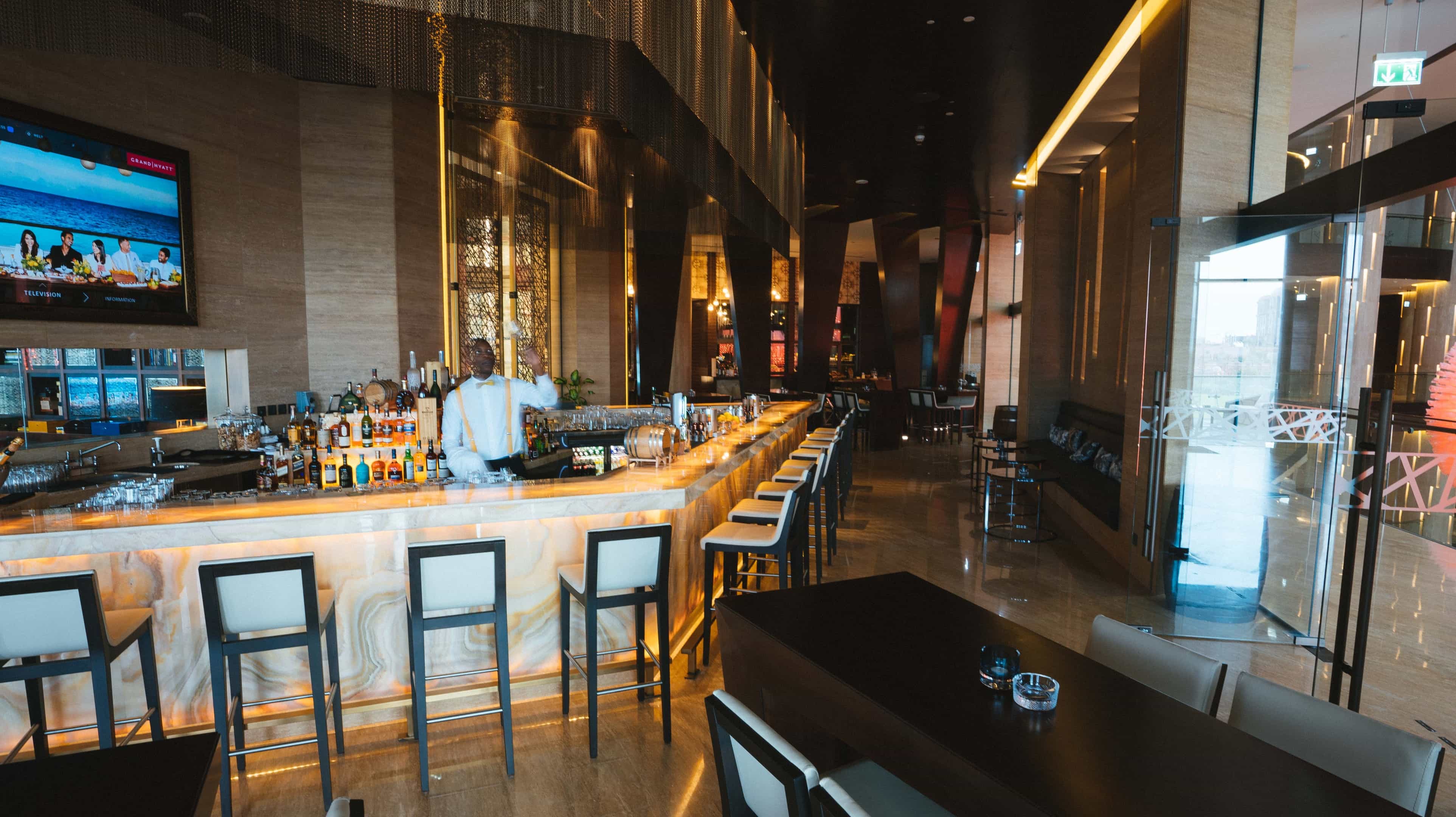 Dostępna jest szeroka gama lekkich posiłków i napojów, aby miło spędzić czas. Dzięki niesamowitemu widokowi na Zatokę Arabską goście z przyjemnością spędzają późne popołudnia przy barze, podziwiając barwny zachód słońca.