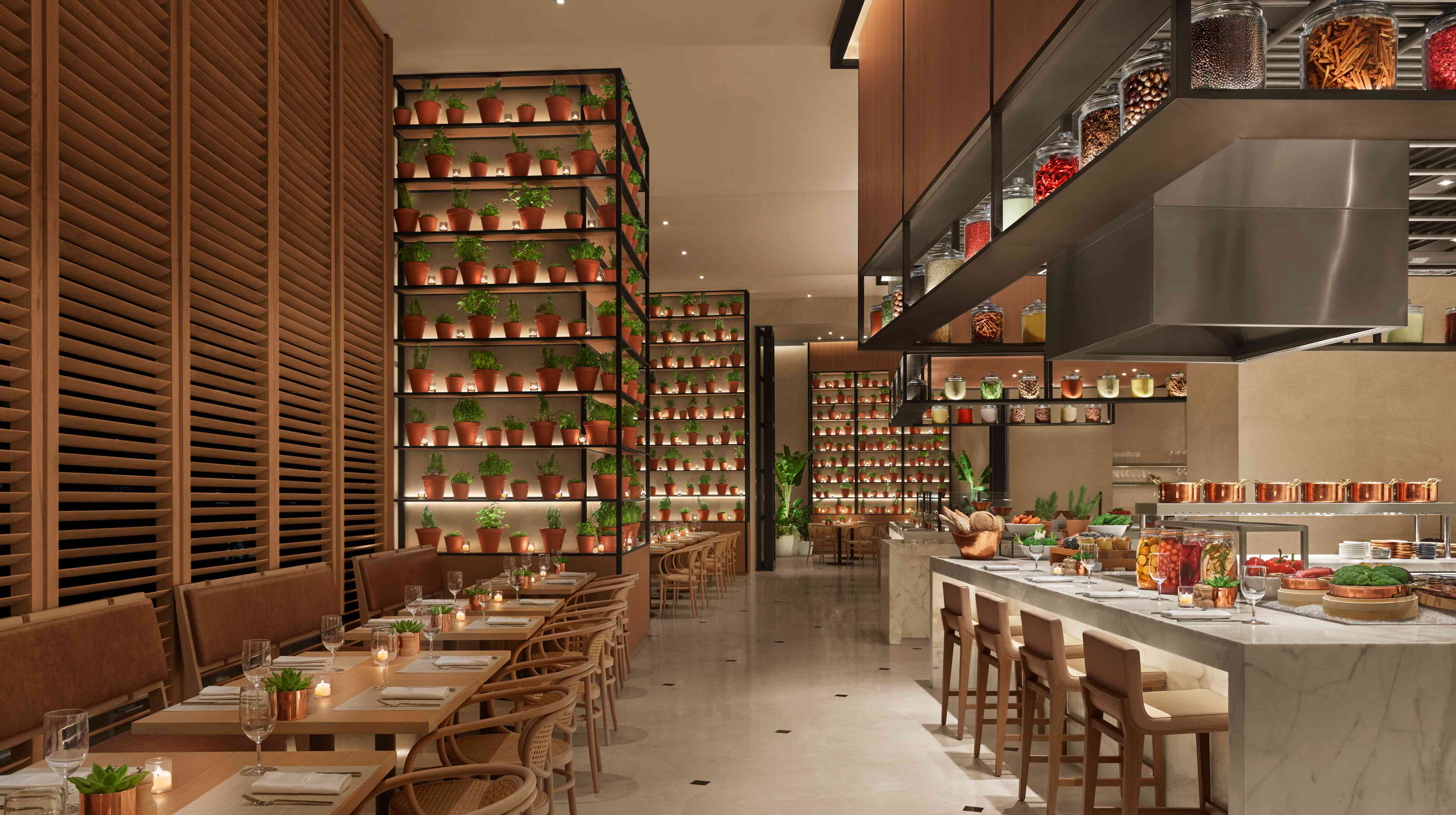 餐厅的氛围轻松休闲,并采用互动风格,将传统用餐方式和户外用餐体验融为一体。餐厅供应国际美食,注重采用新鲜有机食材,实现营养与美味的结合。